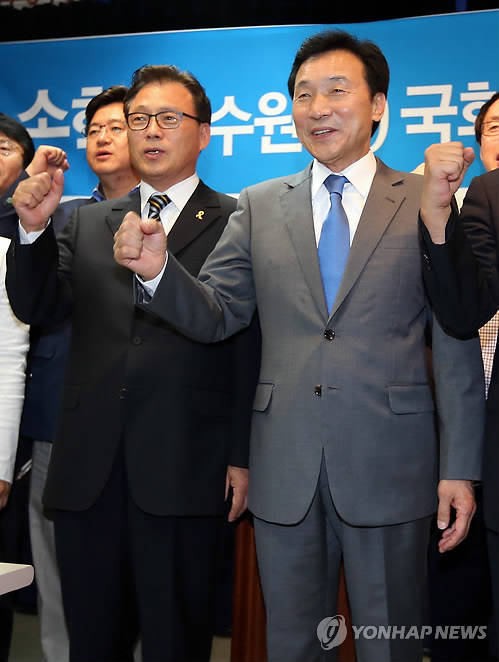 ▲10일 오전 경기도 수원 경기도의회에서 새정치민주연합 손학규 후보(오른쪽)가 7·30 국회의원 수원병 보궐선거 출마 선언을 한 후 수원정 박광온 후보와 함께 '파이팅'을 외치고 있다. (사진=연합뉴스)