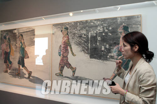 이날 전시를 기획한 권아름 학예연구사가 전시된 배남경 작가의 작품을 설명하고 있다.
