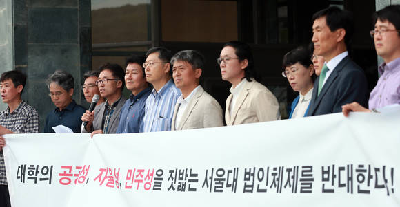 ▲세월호 참사를 계기로 교육정상화를 요구하는 각계의 목소리가 높아지고 있다. 서울대학교 교수들이 지난달 30일 서울 관악구 서울대 본관 앞에서 “대학의 공공성, 자율성, 민주성을 훼손하는 서울대 법인체제를 반대한다”며 기자회견을 열고 있다. (사진=연합뉴스)