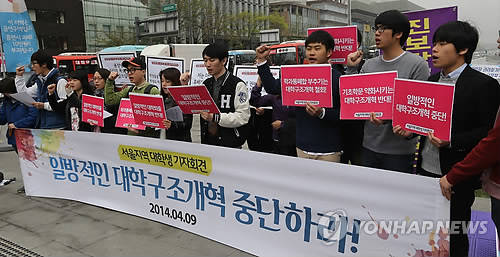 ▲성공회대와 경기대 ,한양대 총학생회, 전국 대학구조조정 공동대책위 소속 학생들이 지난 4월 9일 오전 서울 광화문광장에서 정부의 일방적인 대학구조개혁 철회를 촉구하는 기자회견을 하고 있다. (사진=연합뉴스)
