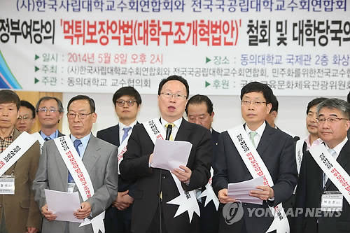 ▲한국사립대학교수회연합회, 전국국공립대학교수회연합회, 민주화를 위한 전국교수협의회, 전국교수노동조합 등 교수단체 임원들이 지난 5월 8일 동의대 국제관에서 기자회견을 열고 정부여당의 대학구조개혁법안철회를 촉구하고 있다. (사진=연합뉴스)