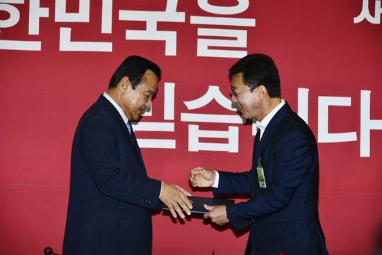 ▲새누리당 이완구 원내대표로부터 공천장을 받고 있는 홍철호 후보