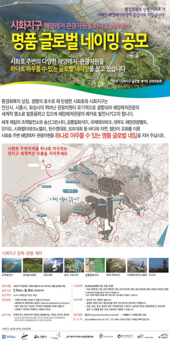 시화호 명품 브랜드화를 위해 마련된 이번 네이밍 공모는 대상에 상금 500만원 등 총 30편에 상금 1000만원을 시상하는 대규모 네이밍 공모전이다.