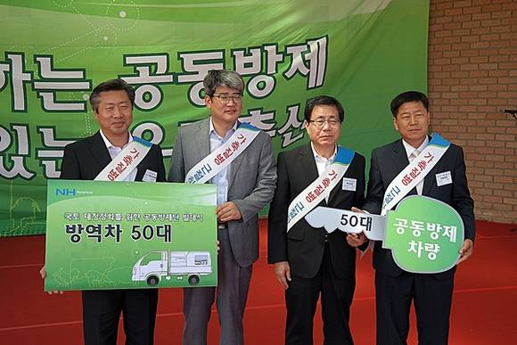 이 자리에서 이동필 농림축산식품부 장관은 농협 임직원의 국토대청정화를 위한 방역결의문을 채택하고 공동방제단 차량을 전달하였으며 농협의 공동방제단 활동으로 우리나라가 가축질병이 발붙일 수 없는 청정축산의 사육환경이 이루어지기를 염원하며 소독시연을 직 접 주관했다.