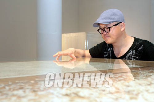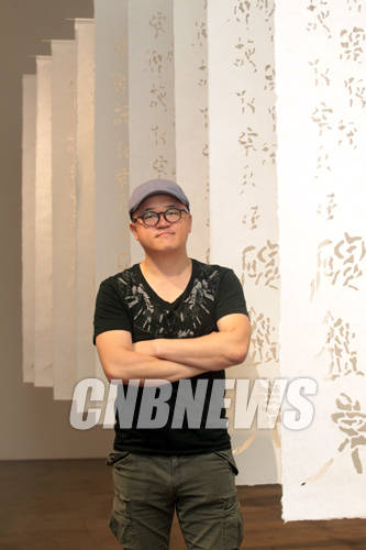 ▲아트사이드 갤러리에 설치된 금강경 작업과 함께한 오윤석 작가.(사진=왕진오 기자)