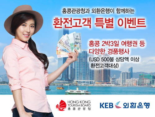 이번 이벤트는 외환은행에서 USD 500달러 상당액 이상 환전 고객을 대상으로 8월 29일까지 진행되며, 추첨을 통해 2박 3일 홍콩여행권 3명(1인2매, 총 6매), 고급 멘도자 여행용 가방(2명) 및 여행잡지 AB-Road 1년 구독권(10명) 등 다양한 경품을 제공한다.