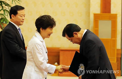 ▲박근혜 대통령이 18일 오전 청와대에서 이병기 국가정보원장에게 임명장을 수여하고 있다.(사진=연합뉴스)