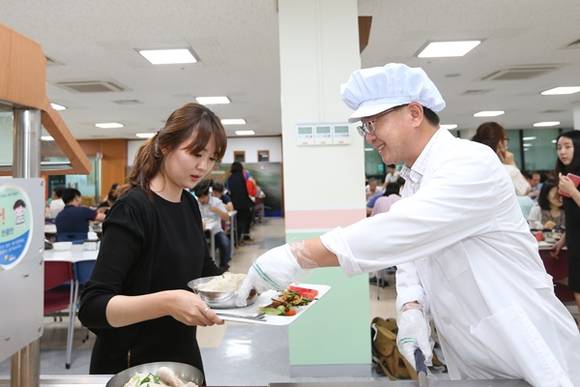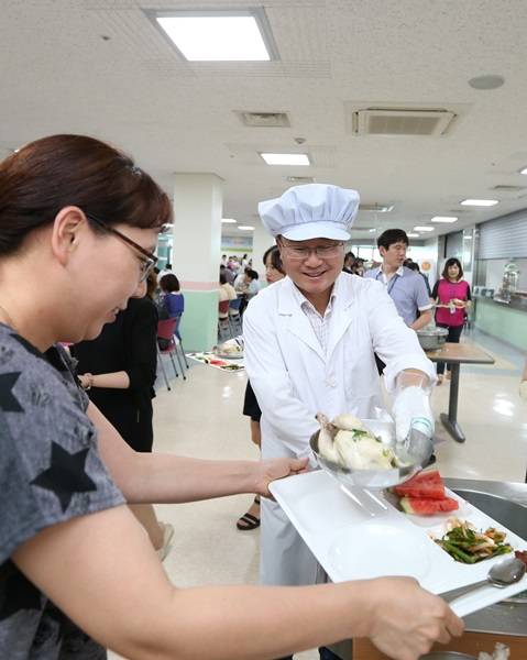 채 시장은 삼계탕 한 그릇을 손수 식판에 올려주며 무더운 여름철을 무사히 보내길 바라는 덕담으로 직원들을 격려했다.