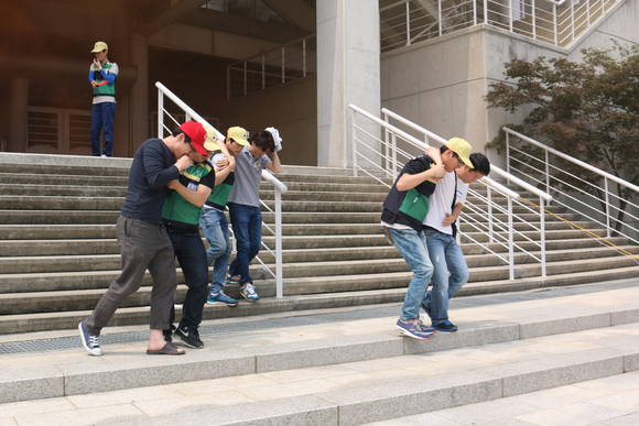 직장대원과 시민들을 대상으로 한 30여분간의 화재예방 교육에 이어 진행된 실제 훈련은 축구경기시합 중 방화에 의한 화재 발생상황을 가정하고 화재신고 방송에 따라 건물내에 있는 50여명의 시민들이 직장 민방위대원 인솔하에 안전하게 대피하는 것으로 진행됐다.