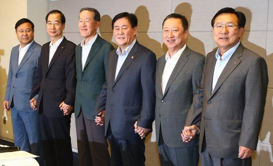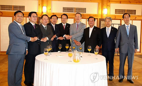 ▲정의화 국회의장과 경제5단체장이 21일 국회 사랑재에서 열린 경제5단체장 오찬 간담회에서 손을 잡고 있다. 왼쪽부터 김영배 경총회장 직무대행, 정우택 정무위원장, 박용만 대한상의회장, 김기문 중기중앙회장, 정의화 국회의장, 허창수 전경련 회장, 정갑윤 국회부의장, 김동철 산업통상자원위원장, 한덕수 무역협회장. (사진=연합뉴스)