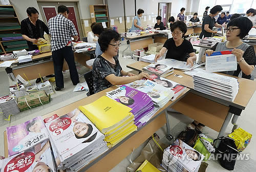 ▲19일 오전 서울 동작구 흑석동주민센터에서 주민들과 주민센터 직원들이 동작을의 투표 안내문과 후보자 홍보물 발송작업을 하고 있다.(사진=연합뉴스)