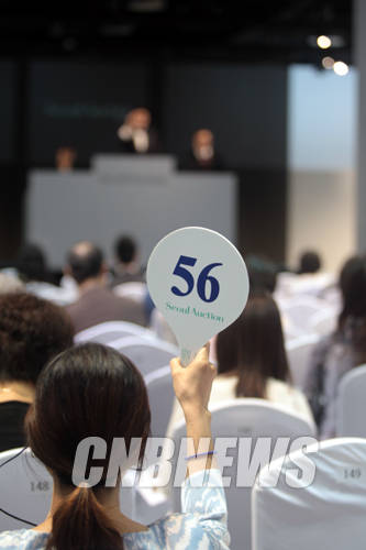 ▲24일 오후 5시 서울 평창동 서울옥션 경매장에서 진행된 기업컬렉션 경매에 나온 작품을 구입하기 위해 응찰자가 패드를 들고 있다.(사진=왕진오 기자)