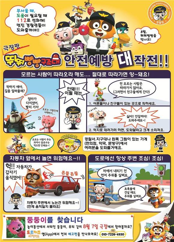경기지방경찰청(청장 최동해)은 ‘아동안전보호망 구축’을 위해 캐릭터 홍보대사인 ‘뛰뛰빵빵 구조대’와 함께 보육원생 800여명을 대상으로 ‘찾아가는 범죄예방교실’을 진행하고 아동안전 포스터와 리플릿을 제작하여 아동안전을 주제로 한 교육용 대형 포스터 3000부와 리플릿 20만부를 제작해 도내 어린이집·유치원 등에 배부하였다.
