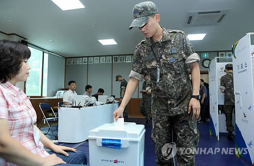 ▲7·30 국회의원 재·보궐선거 사전투표가 실시된 25일 충북 충주시 금가면사무소에 차려진 투표소에서 공군 19전투비행단 장병이 투표하고 있다(충주=연합뉴스)