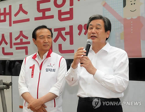 ▲새누리당 김무성 대표(오른쪽)가 26일 경기 수원시 영통구 원천동 한 아프트 상가에서 열린 수원정 임태희 후보 지원 유세에서 유권자들의 지지를 호소하고 있다.(수원=연합뉴스)