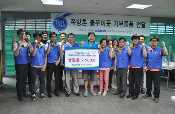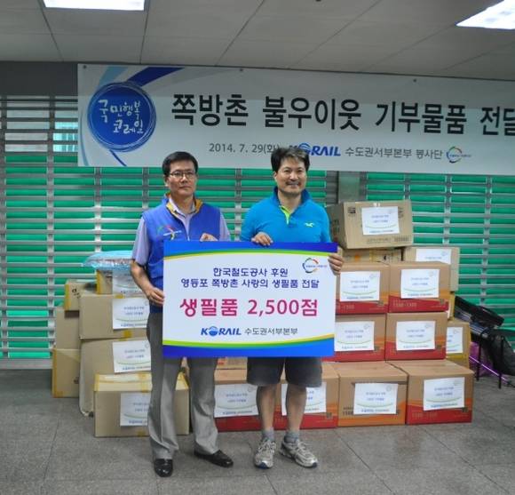 코레일 수도권서부본부(본부장 나민찬)는 29일 나눔 문화 확산과 취약계층 지원활동의 일환으로 영등포역 인근 쪽방촌을 찾아 전직원으로부터 기부받은 물품 2500여점을 전달하였다.