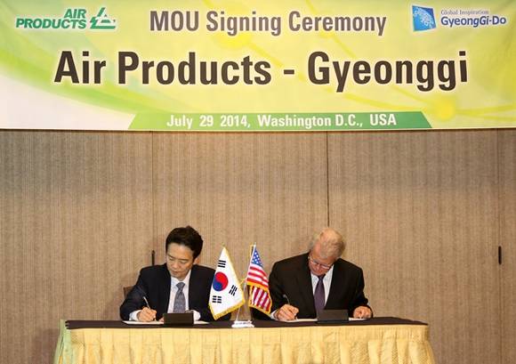 지방외교 강화와 투자유치를 위해 미국을 방문 중인 남경필 경기도지사는 미국 현지시각 29일 오후 2시 버지니아주 알링턴 카운티에 위치한 힐튼 크리스탈 시티 호텔에서 웨인 미첼(Wayne M. Mitchell) 에어프로덕츠 수석부사장과 이같은 내용을 담은 투자협약서에 서명했다. 이날 협약식에는 이수연 에어프로덕츠코리아 대표이사와 최지용·조광주 경기도의원이 함께 했다.