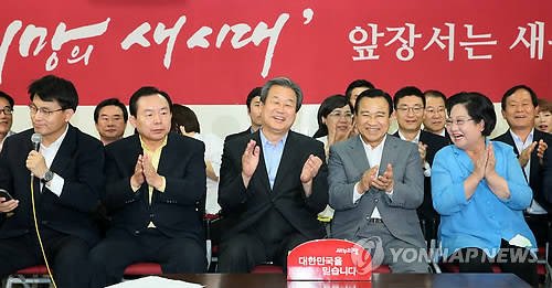 ▲새누리당 김무성 대표, 이완구 원내대표 등 지도부가 30일 밤 서울 여의도 당사에서 동작을 나경원 후보의 당선 확정 소식을 전달받자 환호하고 있다. (사진=연합뉴스)