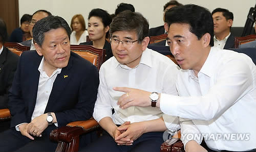 ▲새정치민주연합 주승용 사무총장(왼쪽부터)·김재윤 의원, 박수현 대표비서실장이 30일 국회 대표실에 마련된 선거상황실에서 선거관련 방송을 보며 대화하고 있다.(사진=연합뉴스)