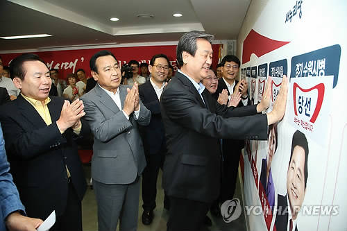 ▲7·30 국회의원 재·보궐선거에서 예상외의 압승을 거둔 새누리당 김무성 대표를 비롯한 이완구 원내대프 이인제, 김을동 최고위원 등 당 지도부가 30일 밤 서울 여의도 당사 선거상황실에서 당선자 스티커를 붙이며 박수치고 있다.(사진=연합뉴스)