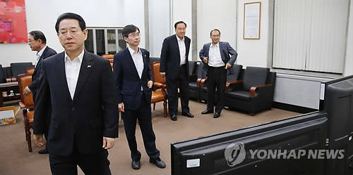 ▲7ㆍ30 재보궐선거에서 참패한 새정치민주연합 김영록 원내수석부대표를 비롯한 조경태 최고위원, 표철수 최고위원 등 당 지도부가 자리를 떠나고 있다.(사진=연합뉴스)