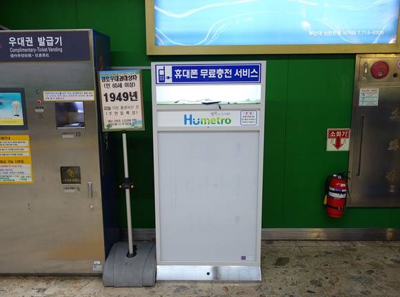 공사는 서면·연산·수영·덕천 등 환승역에는 2개소, 일반역에서는 1개소씩 총 107대의 휴대폰 급속충전소를 설치했으며, 각 충전소에는 안드로이드폰 2대·아이폰 2대·구형 폴더폰 2대 등 6대를 동시에 충전할 수 있다고 밝혔다.