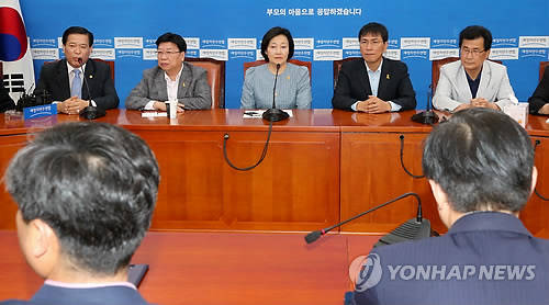 ▲새정치민주연합 박영선 원내대표와 안희정 충남지사, 권선택 대전시장, 이시종 충북지사 등 광역단체장 등 참석자들이 3일 국회 원내대표실에서 열린 비대위 구성 비상회의에서 7·30재보선 참패에 대한 대책과 당의 진로를 논의하고 있다. 이날 회의에는 광역·기초단체장과 시도의회 의장, 시도당위원장이 참석했다.(사진=연합뉴스)
