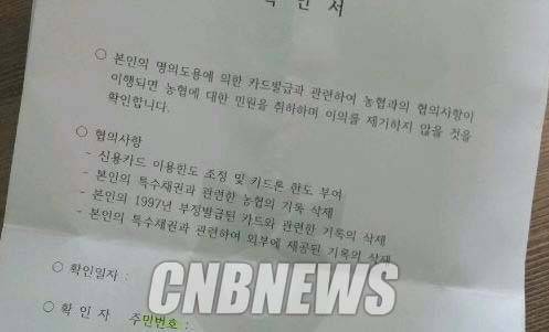 CNB가 입수한 강씨와 농협 간의 합의서에 따르면, “(강씨가 민원을 제기하기 않는다는 조건으로) 특수채권 기록을 삭제하고 신용카드 이용한도 조정 및 카드론 한도를 부여한다”고 명시돼 있다.