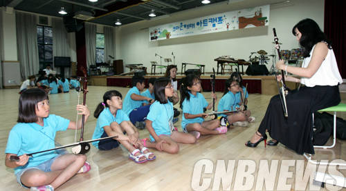 ▲크라운해태아트캠프에서 해금을 배우고 있는 아이들.(사진=한국메세나협회)