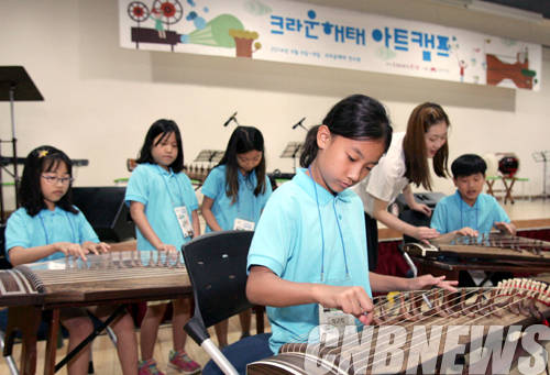 60여명의 어린이와 함께한 이번 캠프의 첫날은 크라운·해태제과가 직접 지원, 운영하고 있는 국악 단체인 ‘락음국악단’이 어린이들과 함께했다.