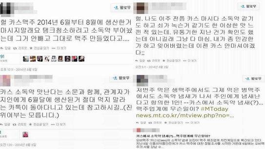 7일 CNB취재진이 국내 유명 동호회사이트와 트위터 등에 유포되고 있는 내용들을 확인한 결과, “올해 6~8월 사이에 생산한 제품은 피하라” “가임기 여성은 카스를 먹어서는 안된다” “카스 생맥주에서 소독약 냄새가 나서 업소주인에게 항의한 적이 있다” “해수욕장 인근의 이마트에서 카스 캔맥주를 사왔다가 냄새가 나서 다 버렸다” “카스의 소독약문제로 (롯데) 클라우드 매출이 엄청 오르고 있다더라” “(오비맥주가) 탱크청소하려고 소독약 부었는데 그거(소독약) 안빼고 카스 만들었다고 들었다” 등의 내용이 주를 이뤘다.