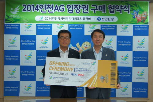 신한은행은 인천아시아경기대회 공식 후원은행으로 홍보캠페인, 공식 기념주화 판매, 성공기원 정기예금 판매 등을 꾀하고 있으며 구입한 입장권은 고객 사은행사 등에 적극 활용할 예정이다.