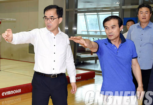 ▲7일 김종 문체부 제2차관(왼쪽)이 오는 9월 19일 개막식을 시작으로 16일간의 열전을 치를 '2014 인천아시아경기대회'를 앞두고 태릉선수촌을 방문해 체력 훈련을 하는 선수들의 훈련 모습을 지켜보고 있다.(사진=문체부)
