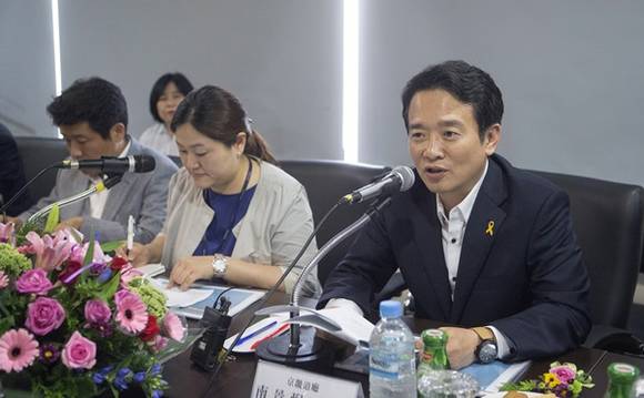 ▲8일 오후 평택 포승단지 내 케이피피(주)본사에서 열린 일본 아이티오 합자투자유치 MOA에서 남경필 경기지사가 MOA 에 서명을 하고 공장을 시찰하고 있다.(사진=경기도 제공)