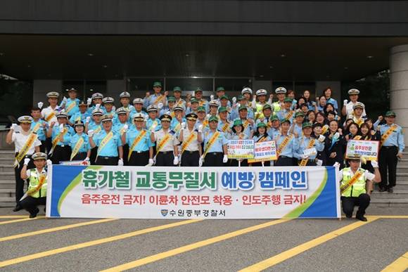 수원중부경찰서(서장 고기철)는 7일 오후수원시 장안구 대평로 소재 정자중심상가 일대에서 경찰서장을 비롯한 교통경찰,모범운전자,녹색어머니,삼운회,새마을교통봉사대 등 90여명이 참석한 가운데 휴가철 교통무질서 예방 캠페인을 실시하였다.