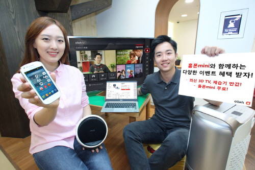 한편, 올레 인터넷과 올레 tv를 동시에 신규로 가입하는 고객에게 무료로 제공하는 홈폰mini의 경우, 지난 해 출시됐던 스마트홈폰 HD의 후속 모델로 4인치 화면의 갤럭시 단말과 디자인을 강화한 스피커독으로 통화 기능뿐만 아니라 라디오, 오디오, TV 등 다양한 콘텐츠와 서비스가 제공되는 스마트 플레이어다.