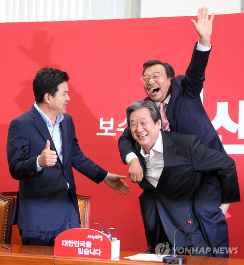 ▲김무성 새누리당 대표가 11일 국회에서 열린 최고위원회의에서 이정현 최고위원을 업어주고 있다. 김 대표는 이 최고위원이 국회의원에 당선되면 업어 준다는 약속을 지켰다고 말했다.(사진=연합뉴스)