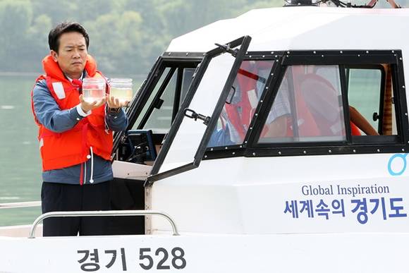 남경필 도지사는 회의 후 순찰선을 타고 팔당상수원 현장을 점검하며 녹조가 발생한 북한강 물과 녹조가 발생하지 않은 남한강 물을 용기에 담은 뒤 “육안으로 보기에도 두 가지 물이 확연히 차이가 난다. 녹조 대책 추진과 예방을 위해 최선을 다하겠다”고 말했다.