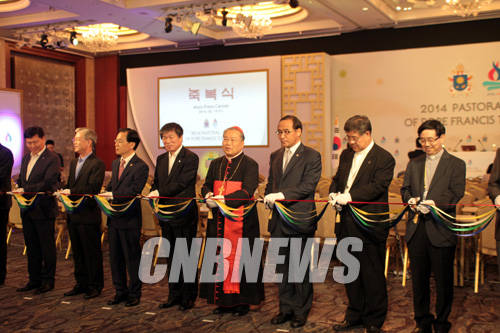 ▲교황 방한을 하루 앞둔 13일 오전 서울 중구 롯데호텔에서 열린 메인 프레스센터 축복식이 열렸다. 이날 함께한 염수정 추기경과 참석자들이 테이프 커팅을 하고 있다.(사진=왕진오 기자)