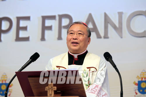 ▲교황 방한을 하루 앞둔 13일 오전 서울 중구 롯데호텔에서 마련된 메인 프레스센터에서 축복식이 열렸다. 이날 함께한 염수정 추기경이 강론을 하고 있다.(사진=왕진오 기자)