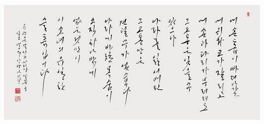 ▲17살의 나이에 나라를 위해 목숨을 바쳤던 유관순 열사가 남긴 유언을 강병인 작가가 붓글씨로 되살렸다. 유관순 열사는 “내 손톱이 빠져 나가고 내 귀와 코가 잘리고 내 손과 다리가 부러져도 그 고통은 이길 수 있사오나 나라를 잃어버린 그 고통만은 견딜 수가 없습니다. 나라에 바칠 목숨이 오직 하나밖에 없는 것만이 이 소녀의 유일한 슬픔입니다”라는 유언을 남겼다. 강 작가는 “말씀 하나하나를 가슴에 안고 칼날 같은 마음으로 글씨를 썼다”고 밝혔다. (마포구청 제공)