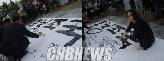 ▲강병인 작가(오른쪽 사진)가 ‘통일조국’이라고 쓴 붓글씨 밑에 시민들이 독립 열사들의 정신을 기리는 글을 쓰고 있다. (사진=도기천 기자)