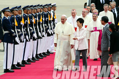 ▲14일 오전 서울공항을 통해 한국을 방문한 프란치스코 교황이 박근혜 대통령의 안내로 의장대를 사열하고 있다.(사진=교황방한위원회)