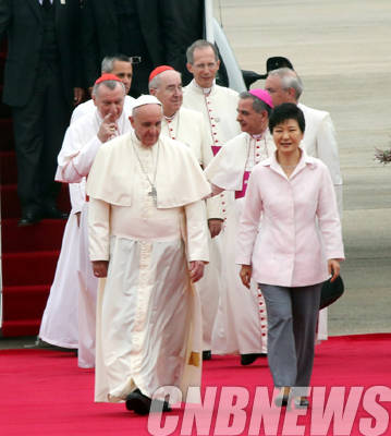 ▲14일 오전 서울공항을 통해 한국을 방문한 프란치스코 교황이 박근혜 대통령의 안내를 받고 있다.(사진=교황방한위원회)