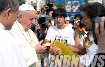 이 자리에는 세월호 특별법 제정을 요구하며 34일째 단식 중인 단원고 희생자 아버지의 손을 잡아주었다. 교황은 세월호 유가족이 전달한 편지를 받았다.