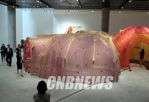 ▲삼성미술관 리움 기획전시실에 설치된 에르네스토 네토의 '심비오인테스튜브타임-향기는 향꽃의 자궁집에서 피어난다' 설치 전경.(사진=왕진오 기자)