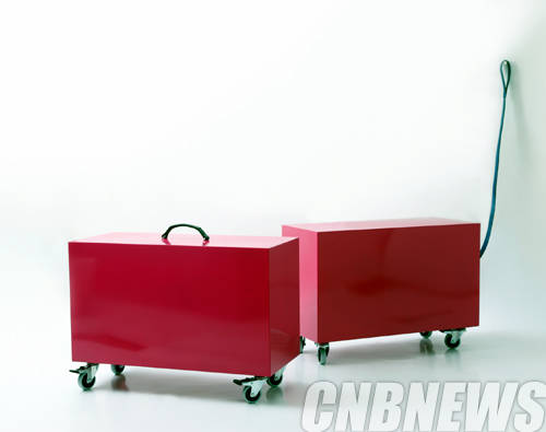 ▲윤성지, '강아지와 가방'. 철, 분체도장, 손잡이, 가죽끈, 바퀴, 55x70x30cm(each), 2014.