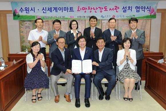 수원시와 신세계이마트가 19일 수원시청 상황실에서 희망도서관 설치.운영에 관한 협약을 체결했다.