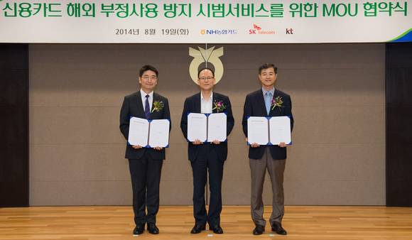 3사는 19일 농협은행 본관에서 이통사의 해외로밍 정보와 카드사의 결제 국가정보를 결합한 ‘신용카드 해외 부정사용 방지 시범서비스’를 위한 상호양해각서(MOU)를 체결했다고 20일 밝혔다.