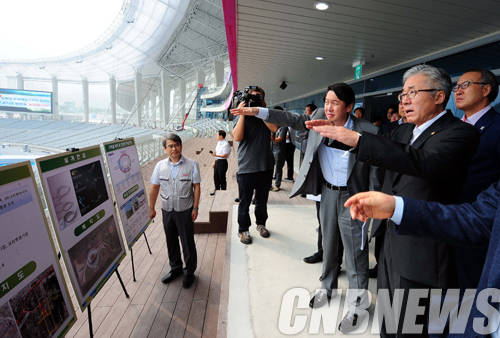 ▲23일 김종덕 문화체육관광부 장관이 9월 중순 인천아시아경기대회가 열리는 주경기장을 찾아 인천아시아경기대회조직위원회 관계자들과 경기장을 둘러보고 있다.(사진=문체부)